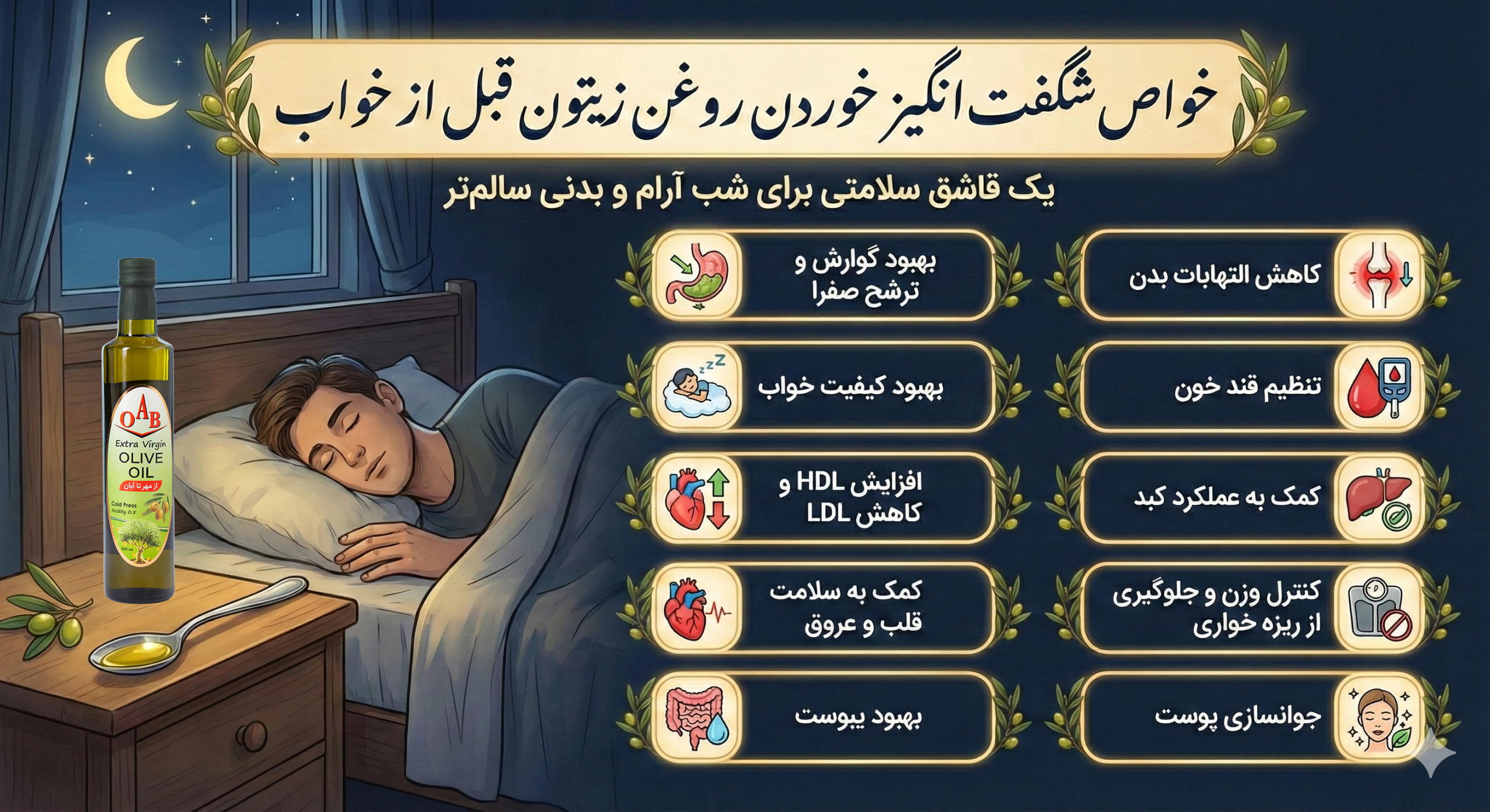 آیا خوردن روغن زیتون قبل از خواب مفید است؟ بله، مصرف روغن زیتون شبانه میتواند به بهبود عملکرد دستگاه گوارش، تنظیم قند خون شبانه و کاهش نوسانات گلوکز کمک کند. این روغن بدون هیچ وابستگی دارویی و در چارچوب تغذیه مدرن، با دارا بودن ترکیبات ضدالتهابی، آنتیاکسیدانها و پلیفنولها، به کاهش التهاب سیستمیک و دردهای مزمن کمک کرده و کیفیت خواب و خواب عمیق را بهبود میدهد. مصرف یک قاشق روغن زیتون فرابکر (Extra Virgin Olive Oil – EVOO) پیش از خواب، بهعنوان حمایت تغذیهای طبیعی برای سلامت متابولیک، گوارش و قلب شناخته میشود.