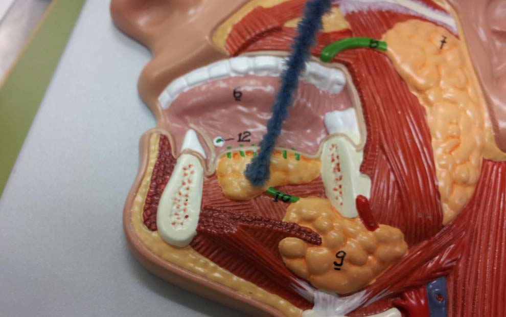 بزاق برای مرطوب نگهداشتن داخل دهان و شروع هضم غذا ضروری است و مانع پوسیدگی دندانها می شود. سه غدۀ بزاقی اصلی در هر طرف (جمعاً شش غده بزاقی اصلی) بعلاوۀ تعداد بسیار زیادی غده بزاقی فرعی که در سرتاسر دهان و لب و حلق ما قرار دارند مسئول تولید و ترشح بزاق به داخل دهان ما هستند. غدد بزاقی اصلی به نامهای بناگوشی، تحت فکی و زیر زبانی نامیده می شوند. در داخل هر کدام از این غدد مجاری باریکی قرار دارد. بزاقی که غده ترشح می کند وارد این مجاری می شود. تعدادی از این مجاری به یکدیگر متصل شده و مجاری بزرگی را تشکیل می دهند و در نهایت این مجاری بزرگتر نیز به یکدیگر متصل شده و مجرایی را تشکیل می دهند که دهانۀ این مجرا به دهان باز می شود. لذا بزاق تولید شده در نهایت به داخل دهان تخلیه می شود. محل وارد شدن مجرای غده بناگوشی به دهان در مجاورت دندانهای پنجم و ششم فک بالاست. اگر در جلوی آئینه زبان خود را بالا ببرید در قسمت جلویی زیر زبان در هر طرف محل ورود مجرای غده تحت فکی را می توانید ملاحظه کنید. غدۀ زیر زبانی نیز از طریق چند مجرای کوچک زیر زبان به دهان راه باز می کند.